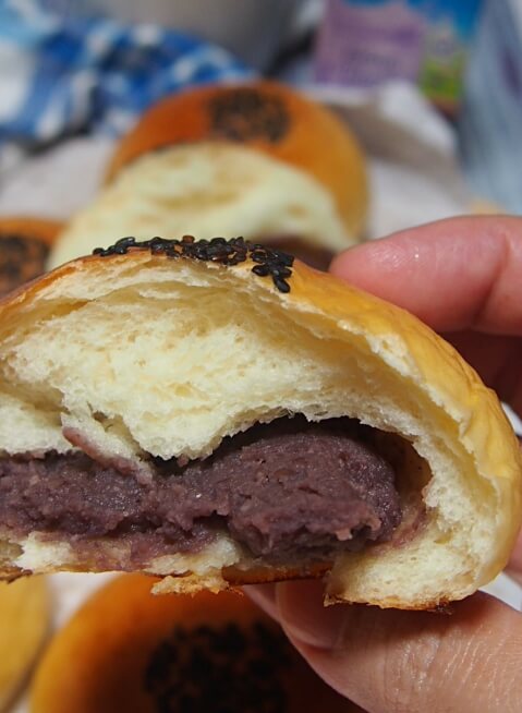 Pipihkan adonan dengan rolling pin, biarkan bagian tengah agak tebal, isi dengan pasta kacang merah, tutup dan bulatkan kembali, tata di loyang bersemir margarin. Lakukan sampai selesai. Biarkan selama kurang lebih 30 – 45 menit. Oles dengan bahan olesan. Celupkan ujung rolling pin ke dalam bahan olesan, balurkan dengan wijen dan tempelkan ke permukaan roti. Lakukan sampai selesai.
